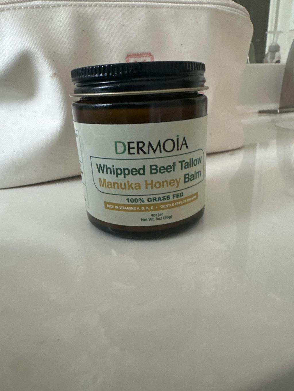 Indulge your skin in the soothing embrace of DERMOIA’s Whipped Tallow + Manuka Honey Balm — a luxurious, nutrient-packed formula designed to calm, repair, and deeply hydrate. Created for those who struggle with dryness, sensitivity, eczema, or environmentally-stressed skin, this balm delivers intense nourishment using a thoughtfully selected blend of natural and time-honored ingredients. Its rich, whipped texture melts effortlessly into the skin, forming a gentle, breathable barrier that locks in moisture and encourages healing, without leaving behind a greasy feel. At the heart of this formulation is Grass-Fed & Finished Beef Tallow, an ancestral skincare remedy packed with vitamins A, D, E, and K, along with essential fatty acids that mimic the natural oils in our skin. This deeply emollient base helps to replenish and restore the skin barrier, especially for those suffering from flaking, cracking, or chronic dryness. Manuka Honey adds a powerful dose of antibacterial and anti-inflammatory action, soothing irritated skin while supporting natural healing. Boswellia Serrata (Frankincense) Oil offers calming properties and has been cherished for centuries for its rejuvenating effects on the skin.To further boost hydration and nourishment, we’ve included Jojoba Seed Oil, a balancing oil that mimics skin’s natural sebum, and helps regulate moisture without clogging pores. DL-Alpha Tocopheryl Acetate, a stabilized form of Vitamin E, acts as a powerful antioxidant that promotes healing and protects against free radical damage.Perfect for use on the face, hands, elbows, feet, or anywhere your skin needs extra care, this balm is free from synthetic fragrances, parabens, and harmful additives — making it a safe, non-irritating choice for all ages and skin types. With every application, your skin will feel soothed, strengthened, and beautifully nourished.